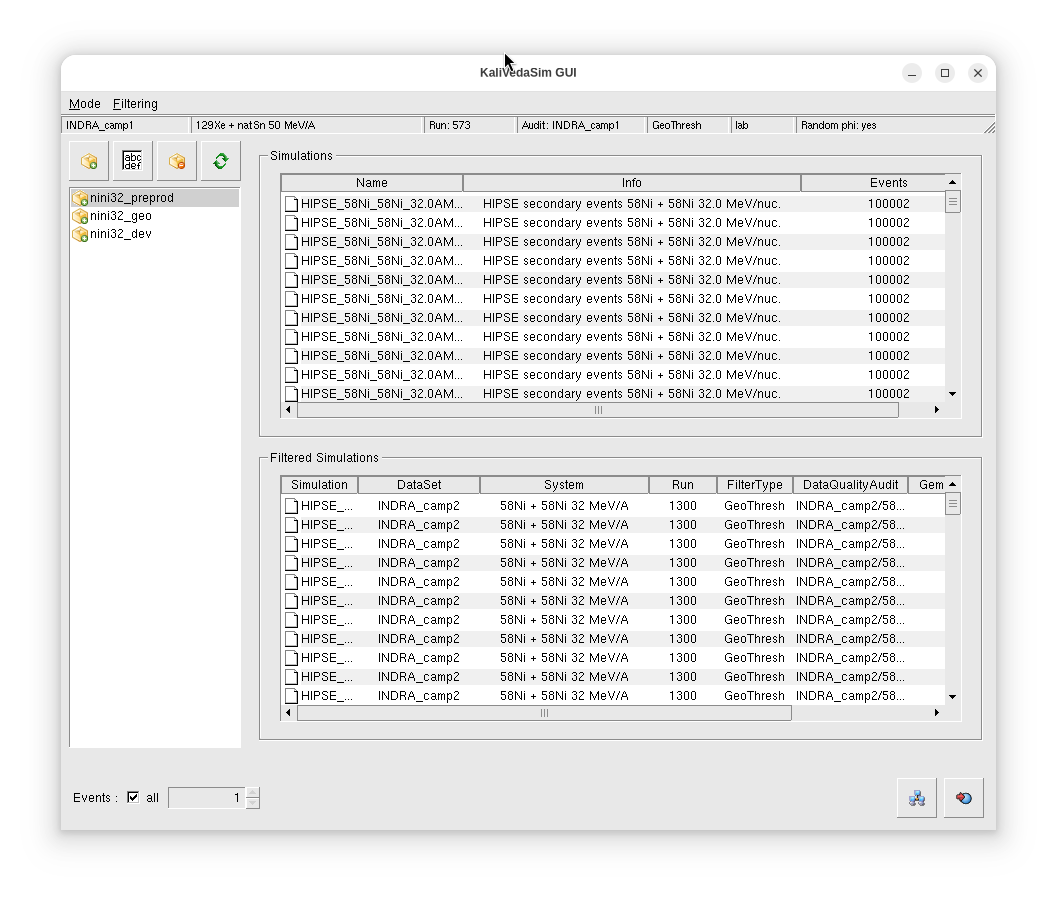 This is the GUI which can be run using the command KaliVedaSim. It can be used for running analyses of simulated data, including 'filtering' simulations according to the experimental set-up of a given dataset. It interfaces with PROOFLite for running parallel jobs on multi-core machines, and with the batch system at the IN2P3 Computing Centre in Lyon.